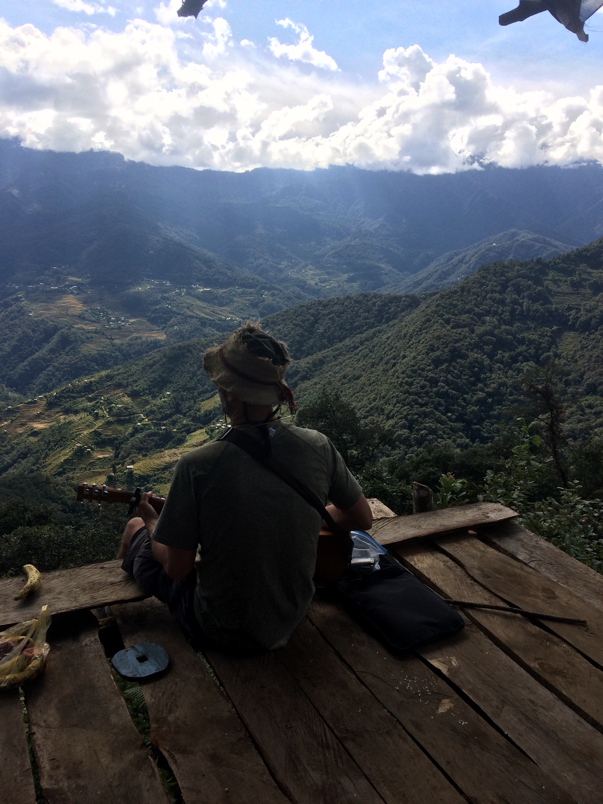 After breakfast, first Sikkim, then Gyem, took me hiking. I donned my full trekking pack as yes I have a dream for my next country. 4 days of hiking to villages for temples, archery, and yes guitar.