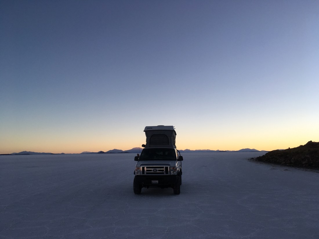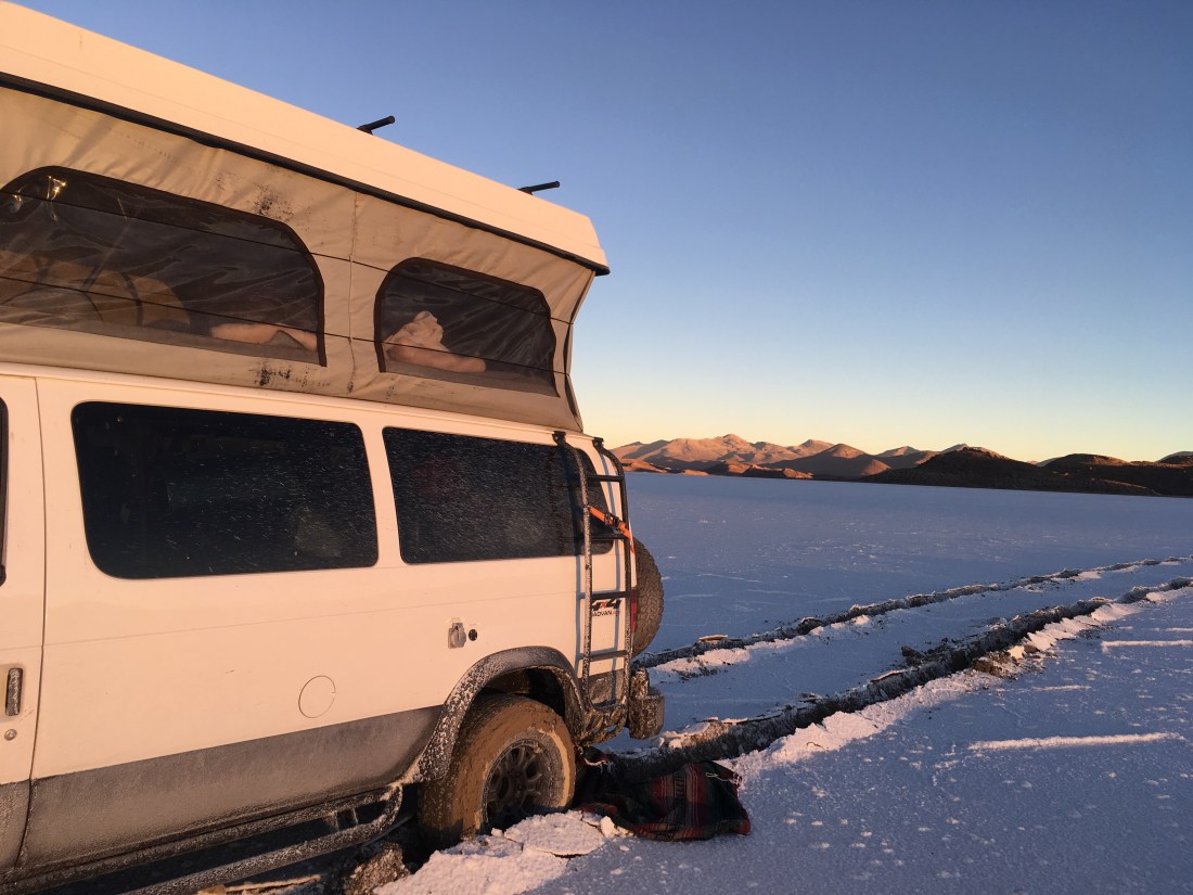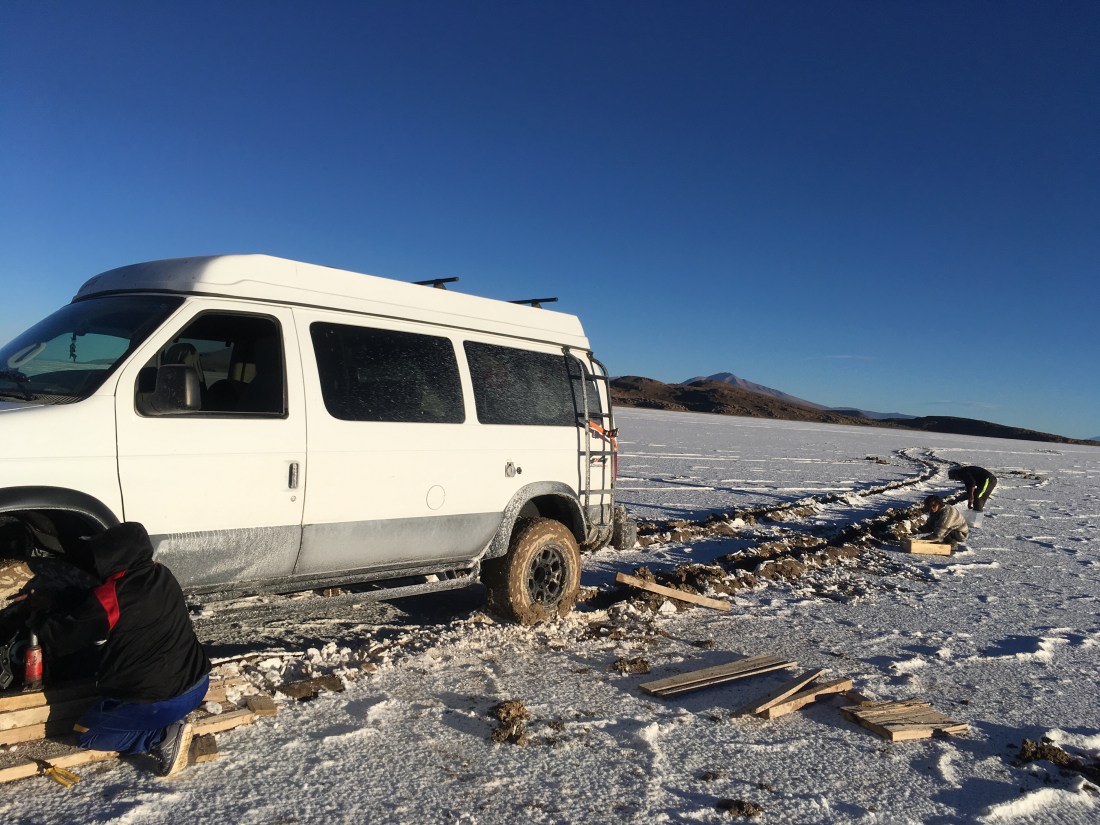 Joking I only had one beer left, we made our way back to the van, carrying wood planks and a jack. They assessed the problem, and got to work. Over the next four hours, they jacked up all four tires on my heavy van and put the broken pieces of salt we all gathered painstakingly in the fading light underneath the tires to create a surface. Once jacked, they pushed me up on the planks and said go for it. I did. I immediately bogged again. Now back to the same process. Jack up, put in salt, then wood. Each time took 90 minutes.