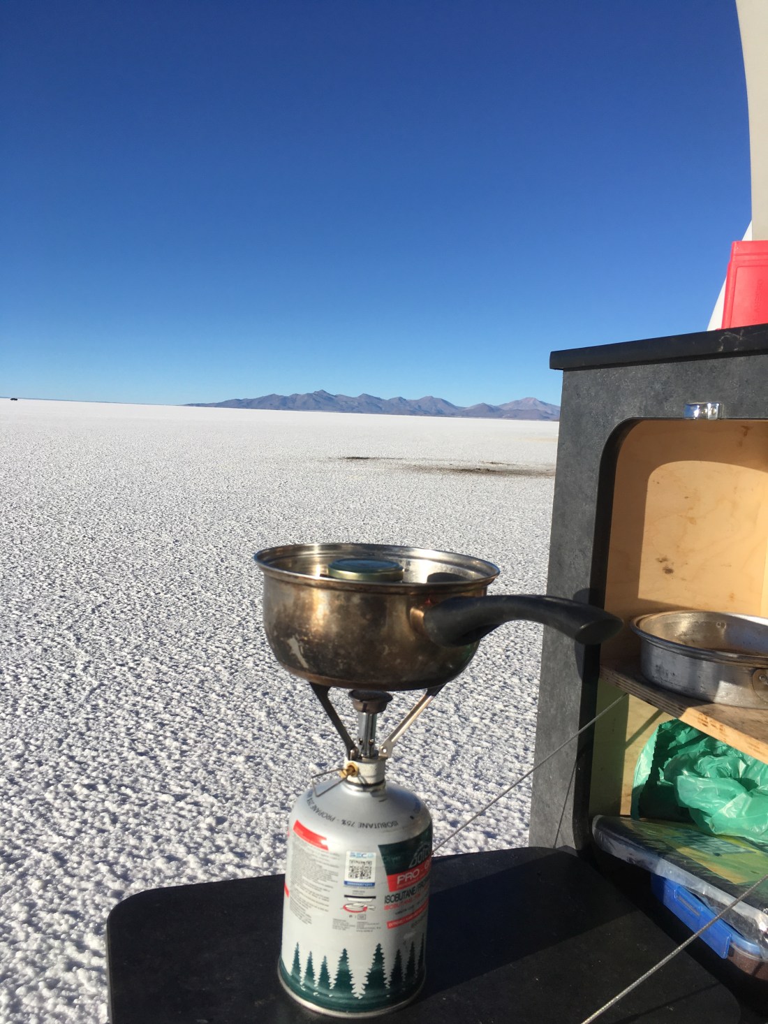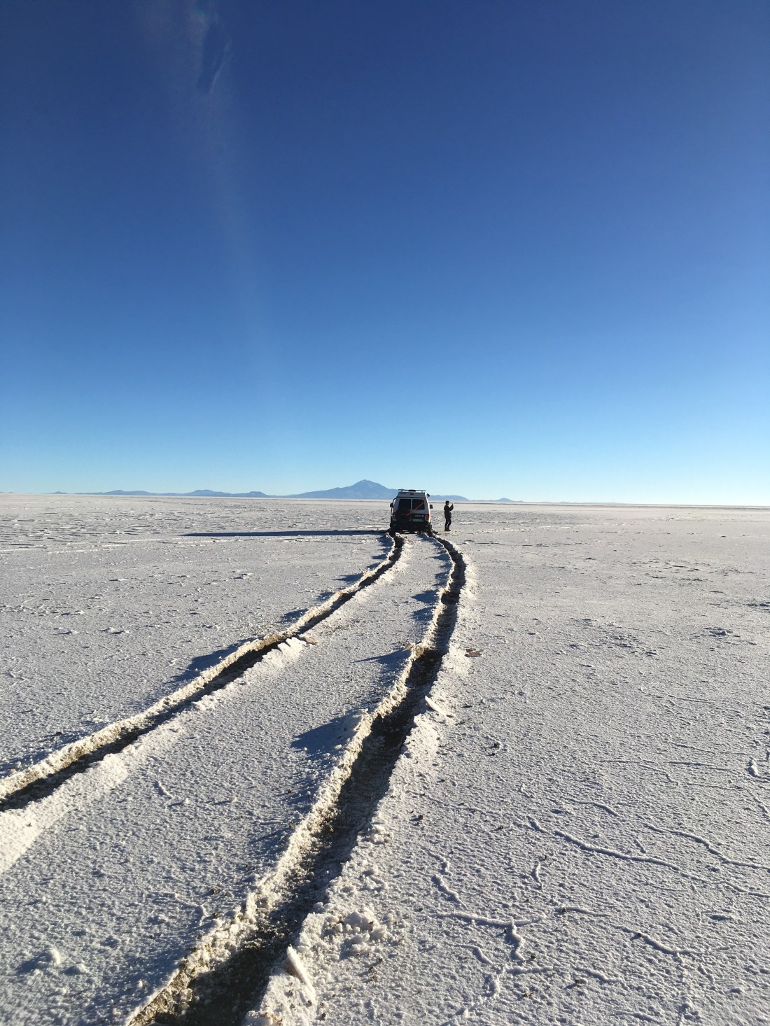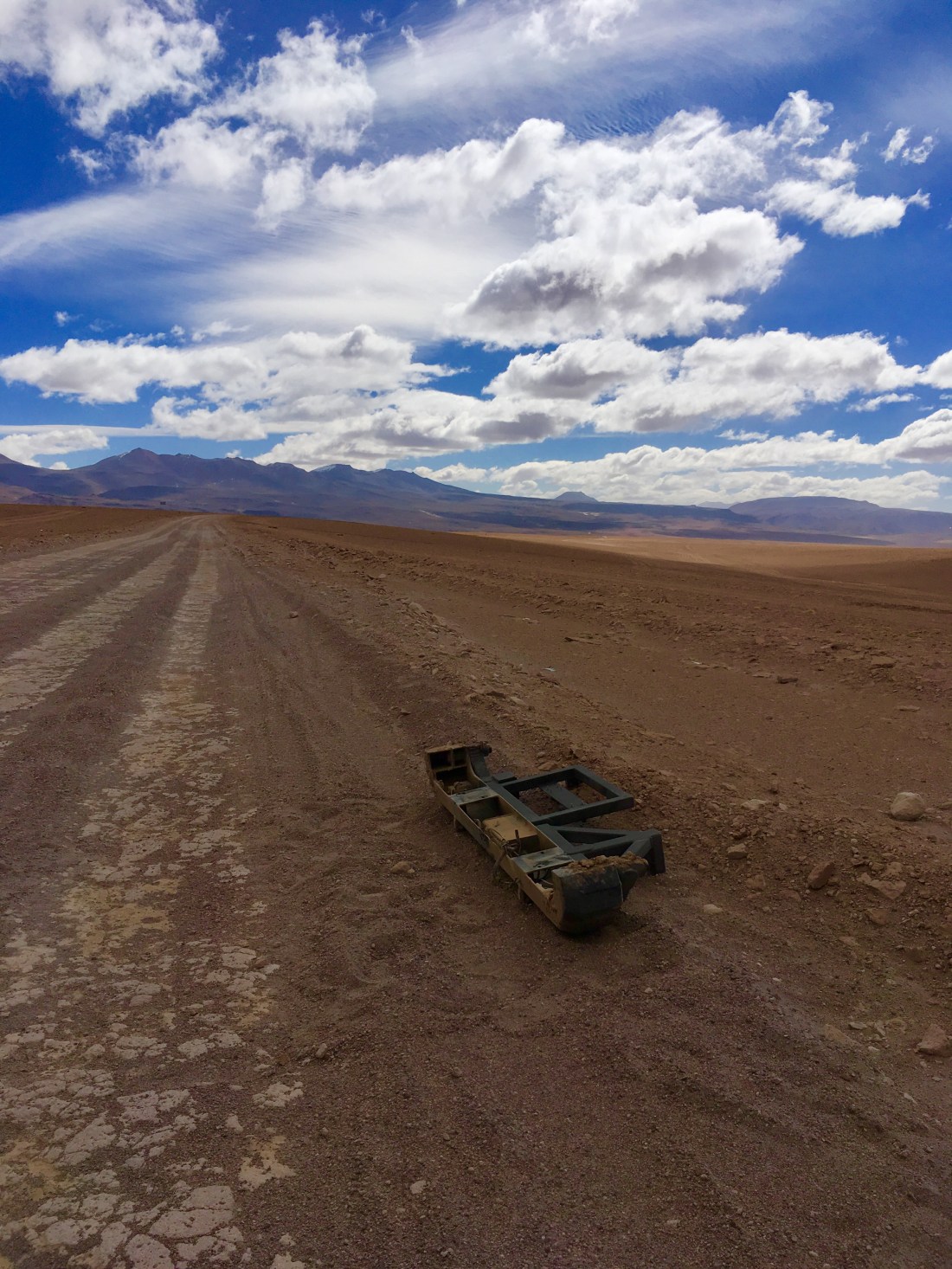 As we climbed to Uyuni, we realized the back bumper of the van (that was super burly and heavy and held the spare tire) was separating from the van. I used a strap to hold it on and stupidly did not get it repaired. The shocks were enough of a scare and once repaired and gassed up, we were on to the Salt Flats.